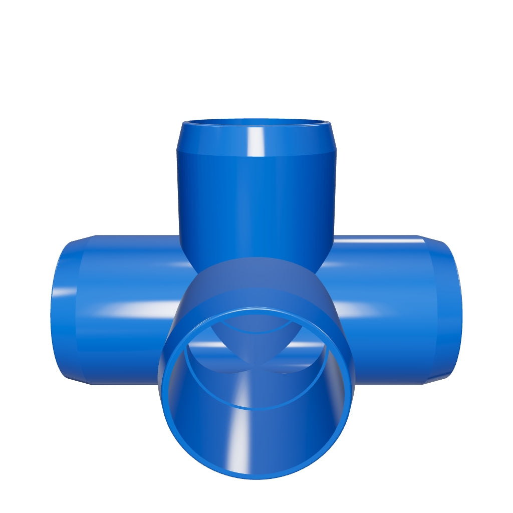 FORMUFIT 1 in. 5-Way PVC Cross fittings in Blue connect 1" Size PVC pipe at five points on three planes. 5-Way Cross fittings are essential when building a base, stand, or footing application. 5-Way fittings have four sockets in a cross configuration and a fifth for perpendicular connections.