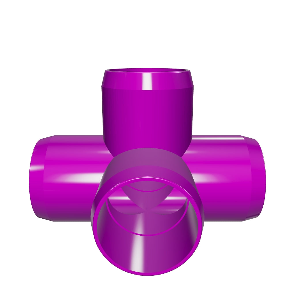 FORMUFIT 1 in. 5-Way PVC Cross fittings in Purple connect 1" Size PVC pipe at five points on three planes. 5-Way Cross fittings are essential when building a base, stand, or footing application. 5-Way fittings have four sockets in a cross configuration and a fifth for perpendicular connections.